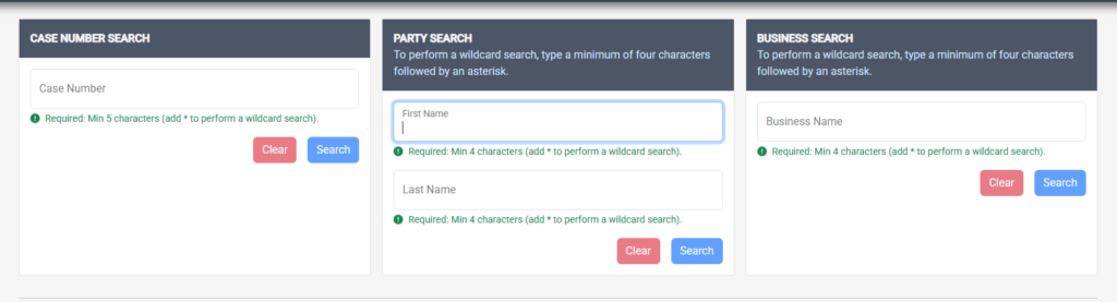 - If you don’t have the case number, type the full legal name of a party (defendant or plaintiff).
